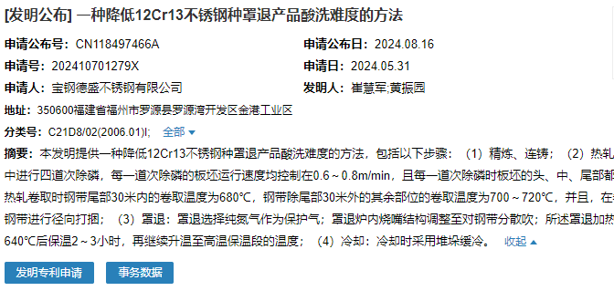 2024年8月16日,寶鋼德盛不銹鋼有限公司成功申請一項名為“一種降低12Cr13不銹鋼種罩退產(chǎn)品酸洗難度的方法”專利,申請公布號為CN118497466A,申請日期為2024年5月31日。
